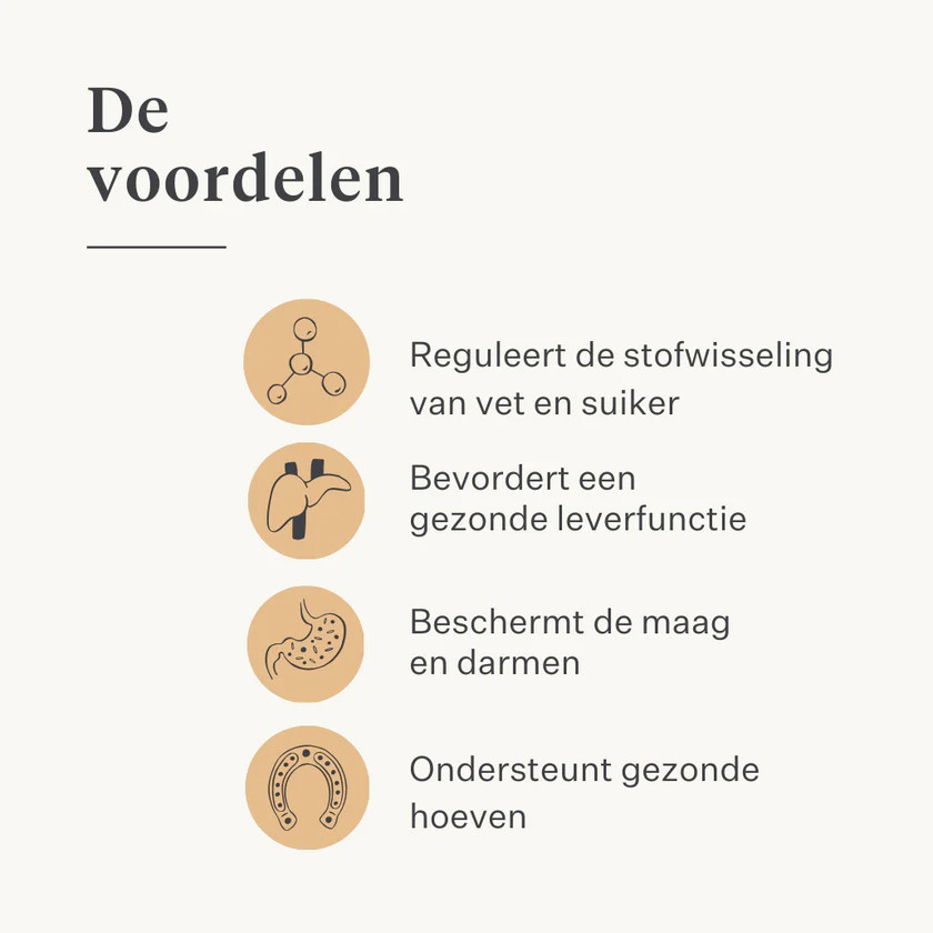 Een plantaardig supplement met 10 wetenschappelijk onderbouwde ingrediënten om de lever te ondersteunen en je paard te helpen paard bij het behouden van een evenwichtig suiker- en vetmetabolisme. Het bevat tevens belangrijke bouwstoffen voor de hoeven en bevordert de doorbloeding, wat essentieel is voor sterke en gezonde hoeven.